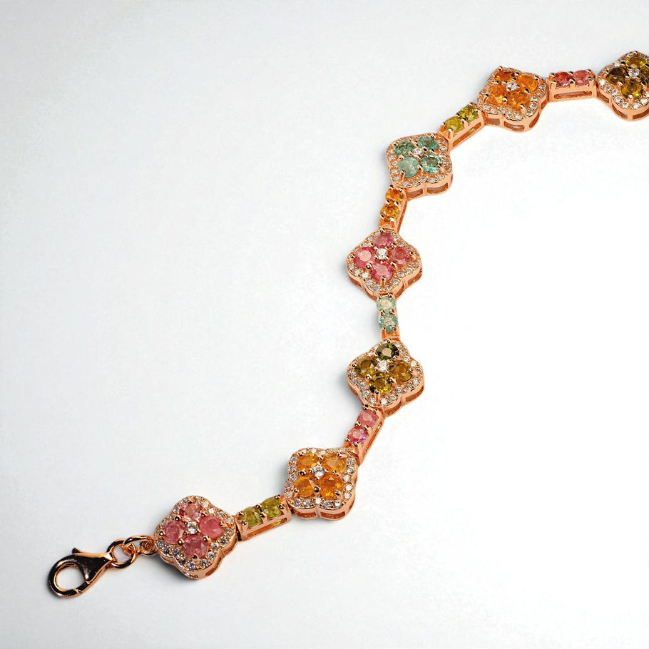 This bracelet is composed of modular four-leaf clover units, centered on round-cut natural tourmalines. The design is predominantly pink, accented by select clusters of green, blue and yellow gemstones to create visual rhythm. Each clover form is framed in pavé-set zircon, enhancing its contour definition. Closely linked segments ensure a flexible structure with a fluid silhouette.