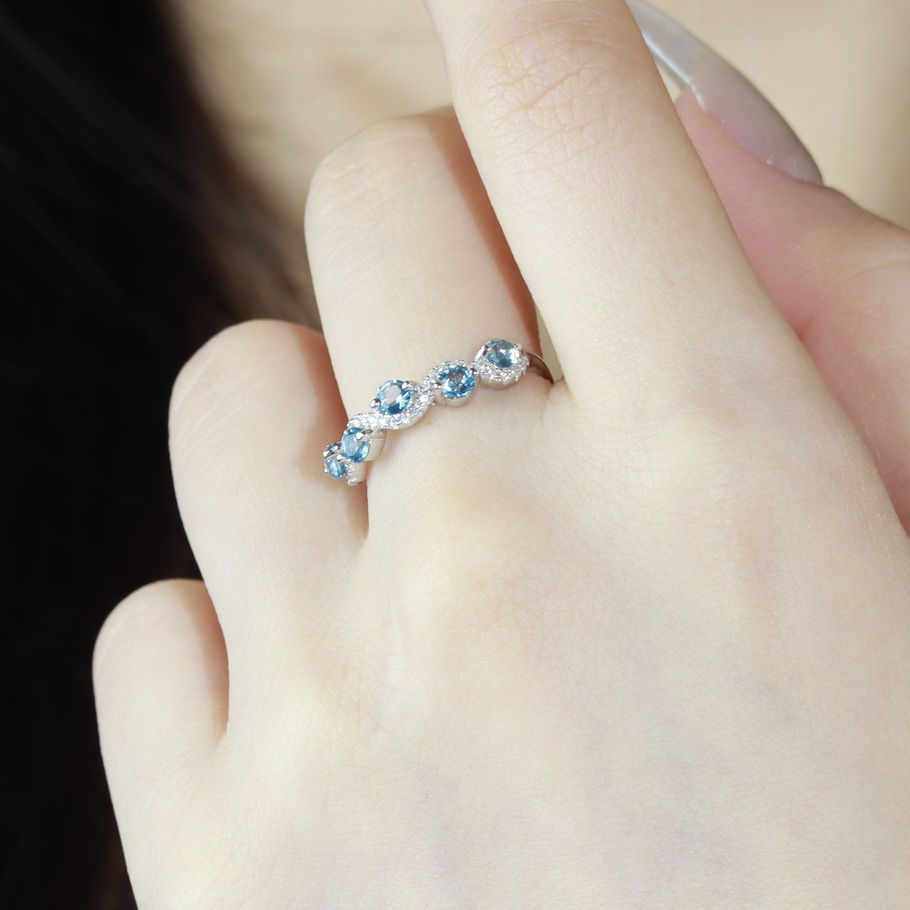 The ring features five round-cut natural blue topaz stones, aligned in a gentle curve across the upper band. Micro-set zircon accents fill the spaces between each gem, maintaining visual continuity and balance. Prong settings and a subtly arched band ensure a seamless fit along the finger, emphasizing proportional clarity and compositional restraint.